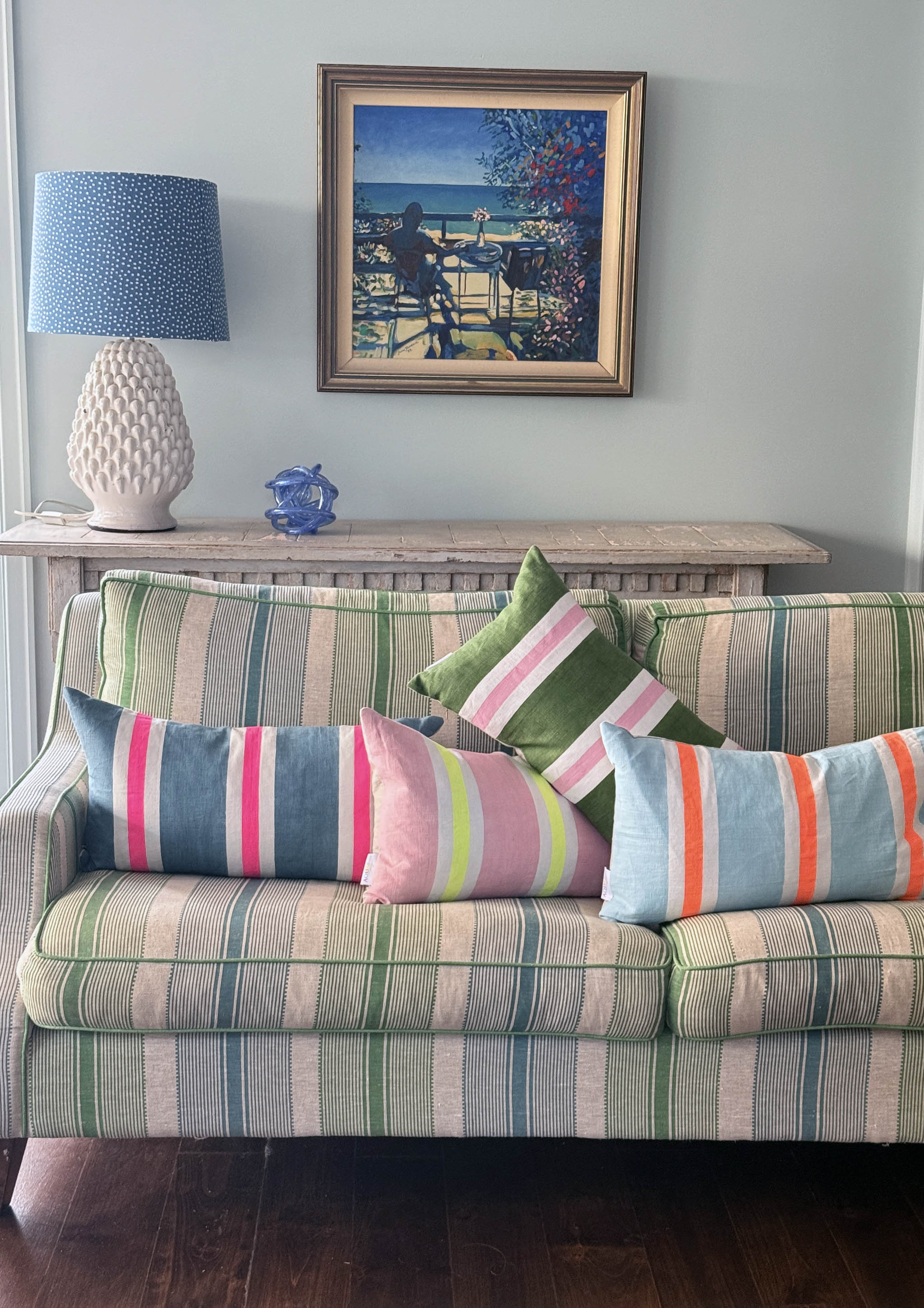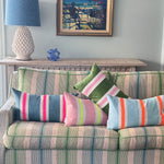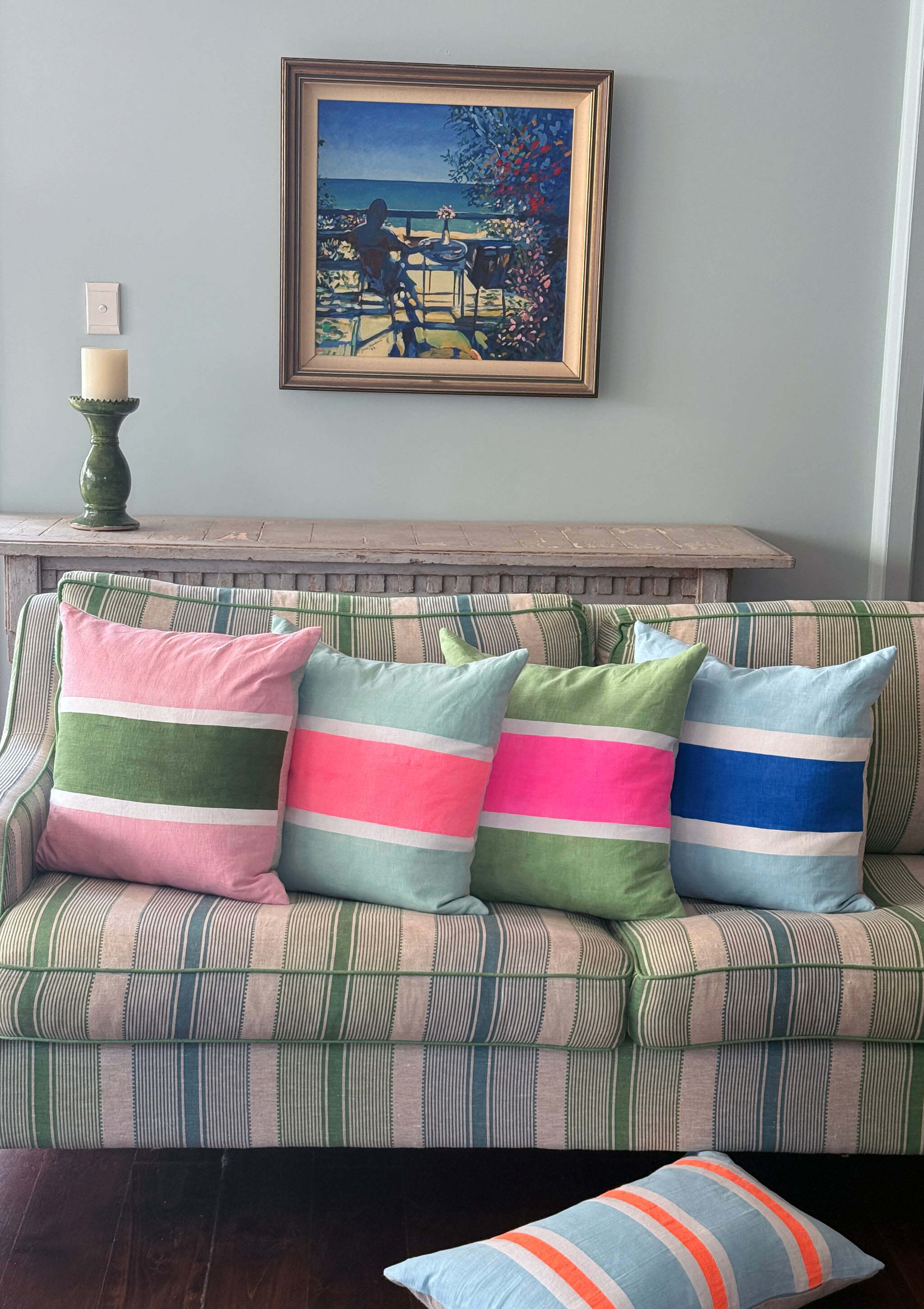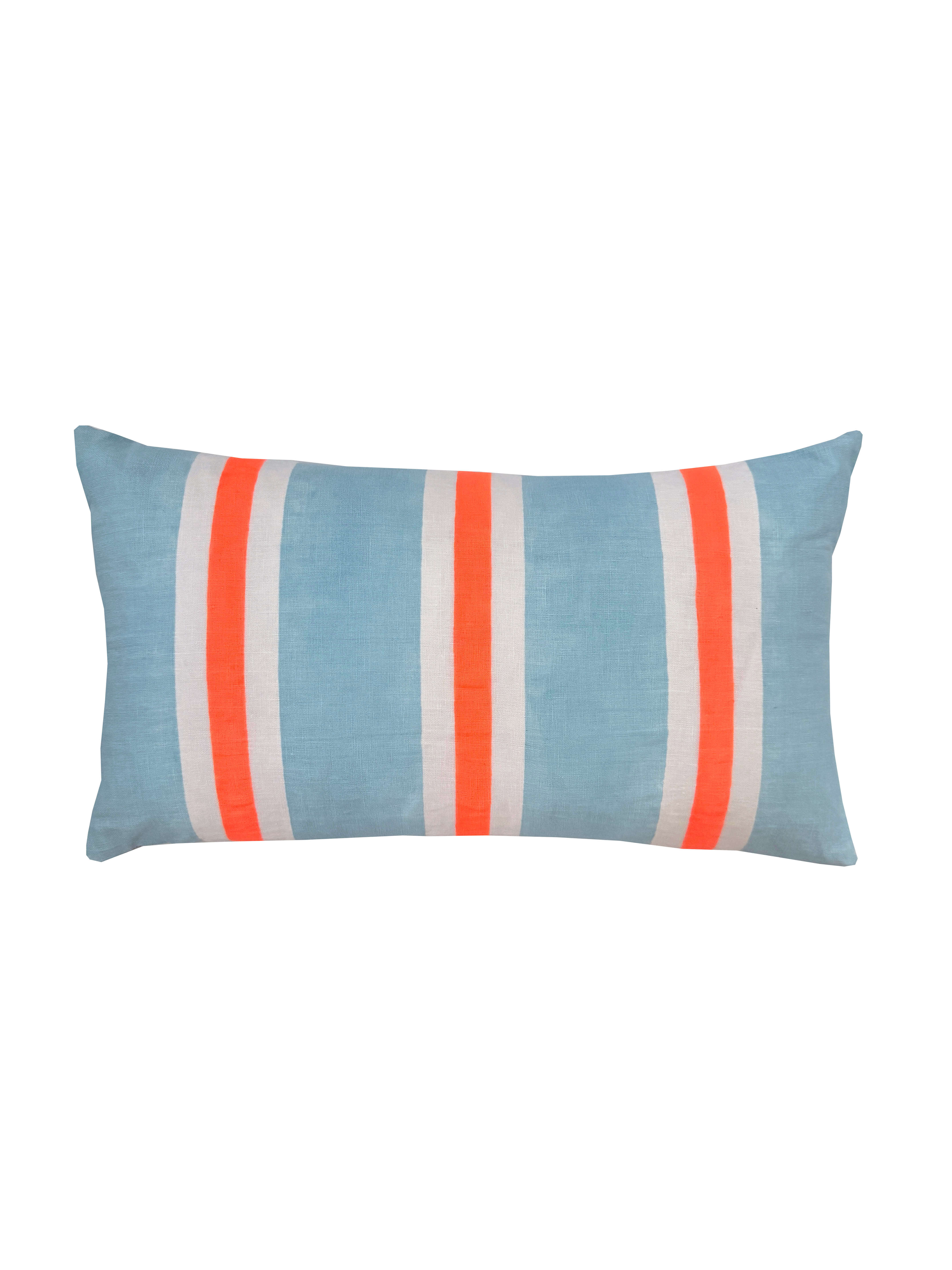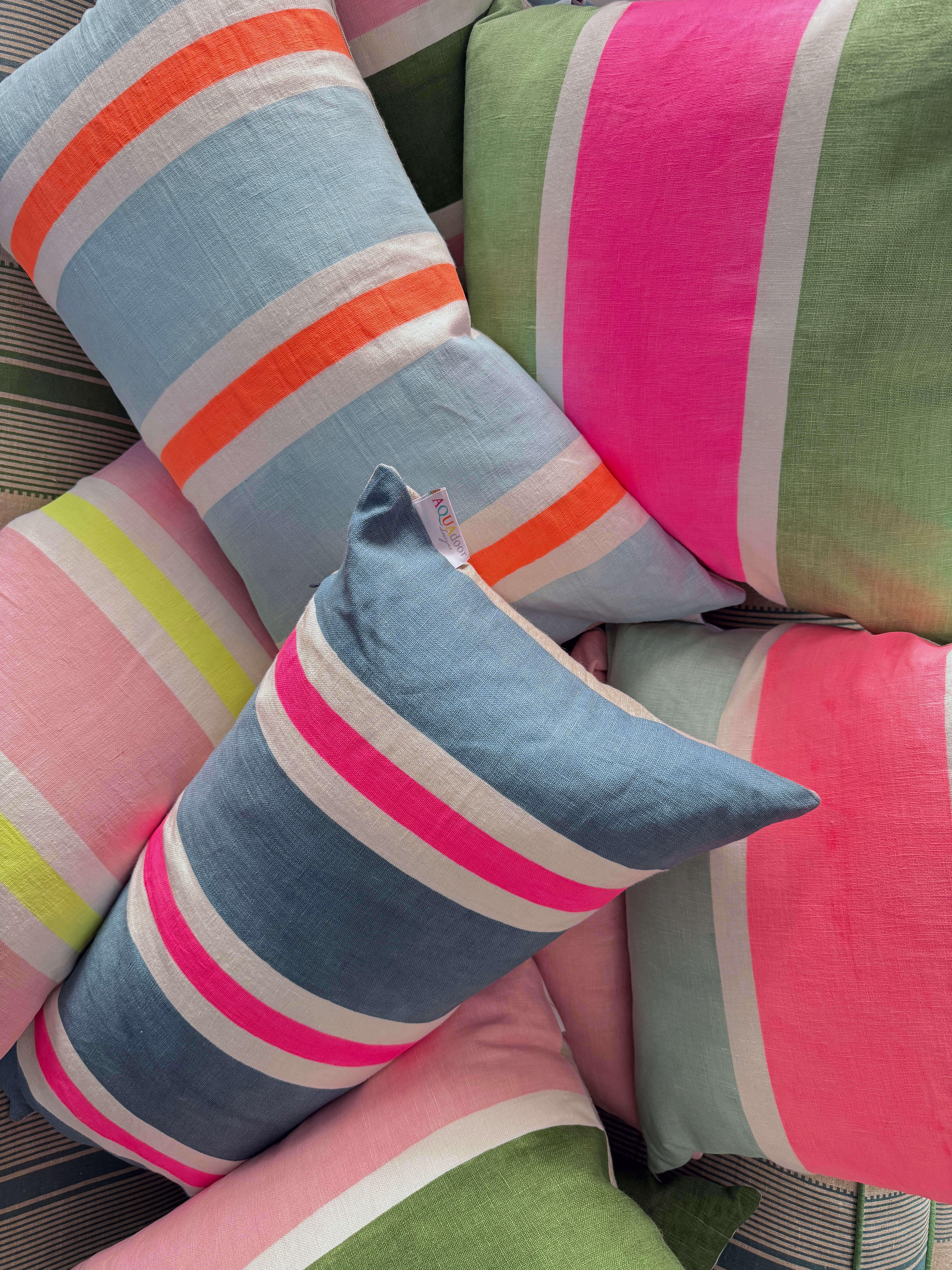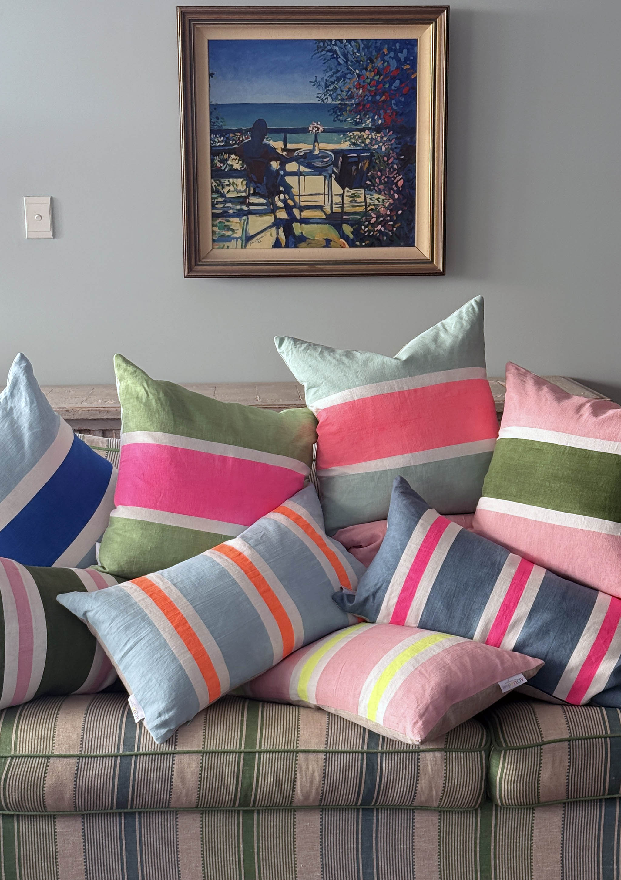 Add a pop of colour to your living room or bedroom with our hand painted cushions. Vibrant neon orange stripes are painted with powder blue onto off-white linen. Reverse side is plain natural linen.