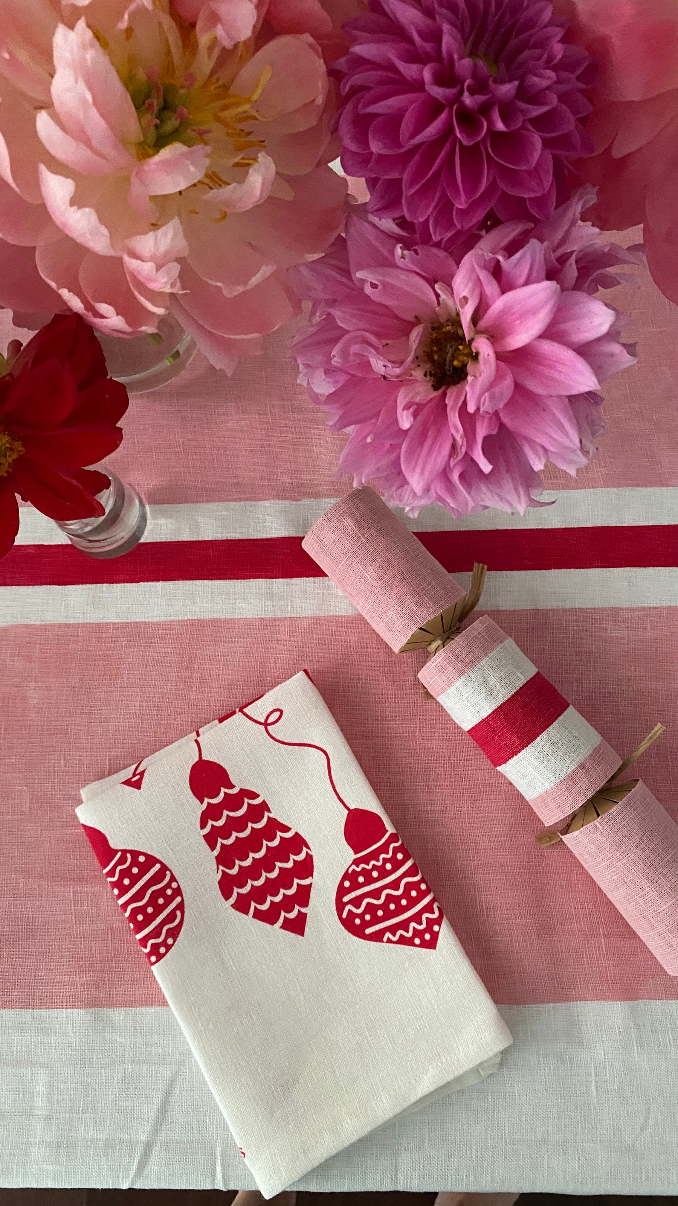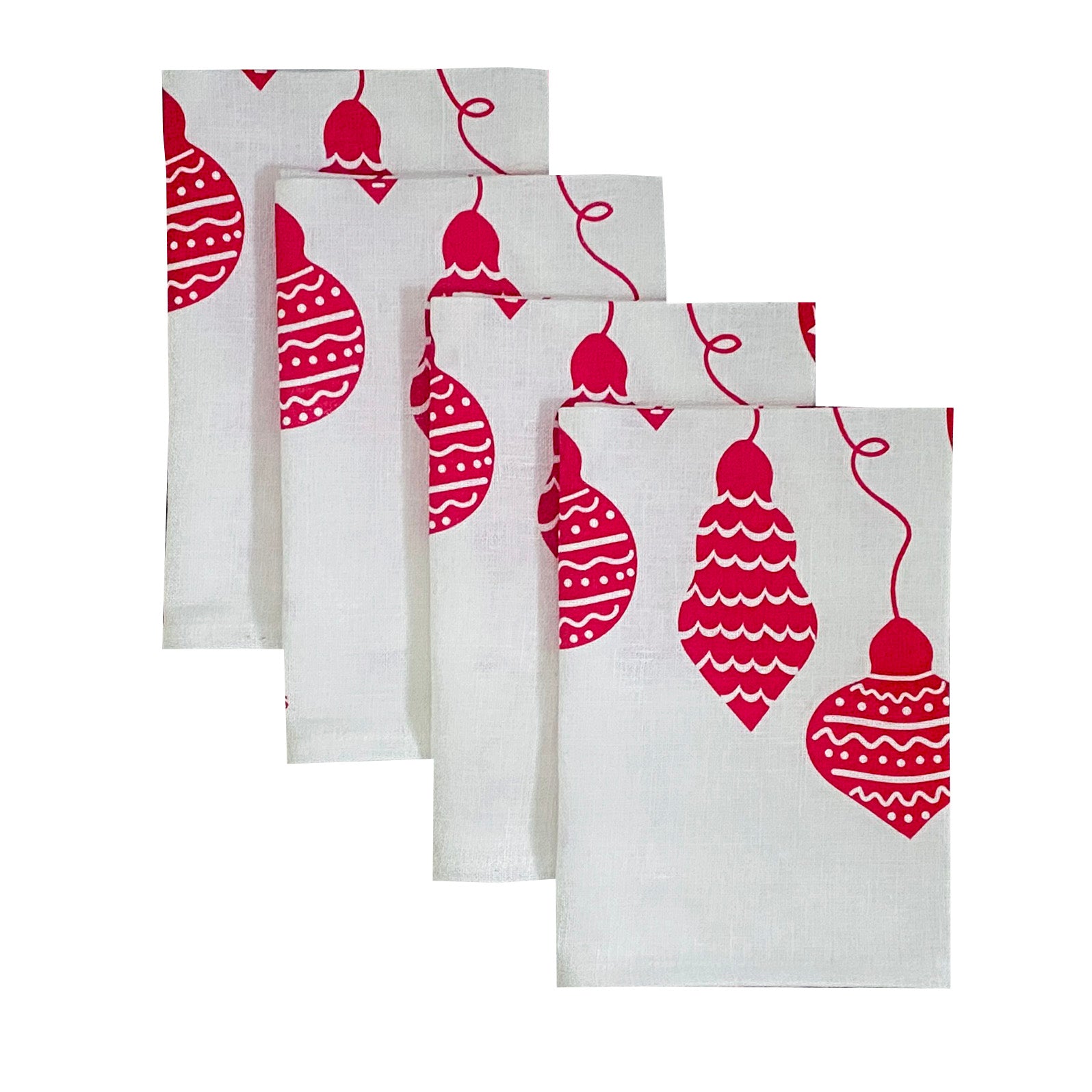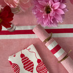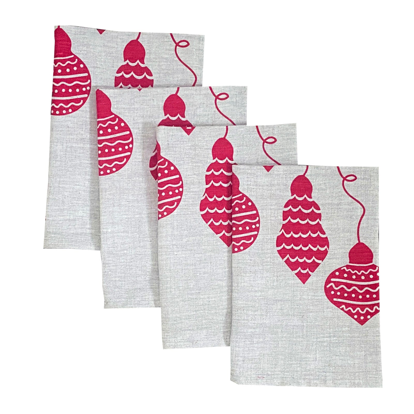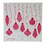 Fun + festive multi patterned Christmas baubles are hand screen printed in red ink on either off-white or natural linen napkins.