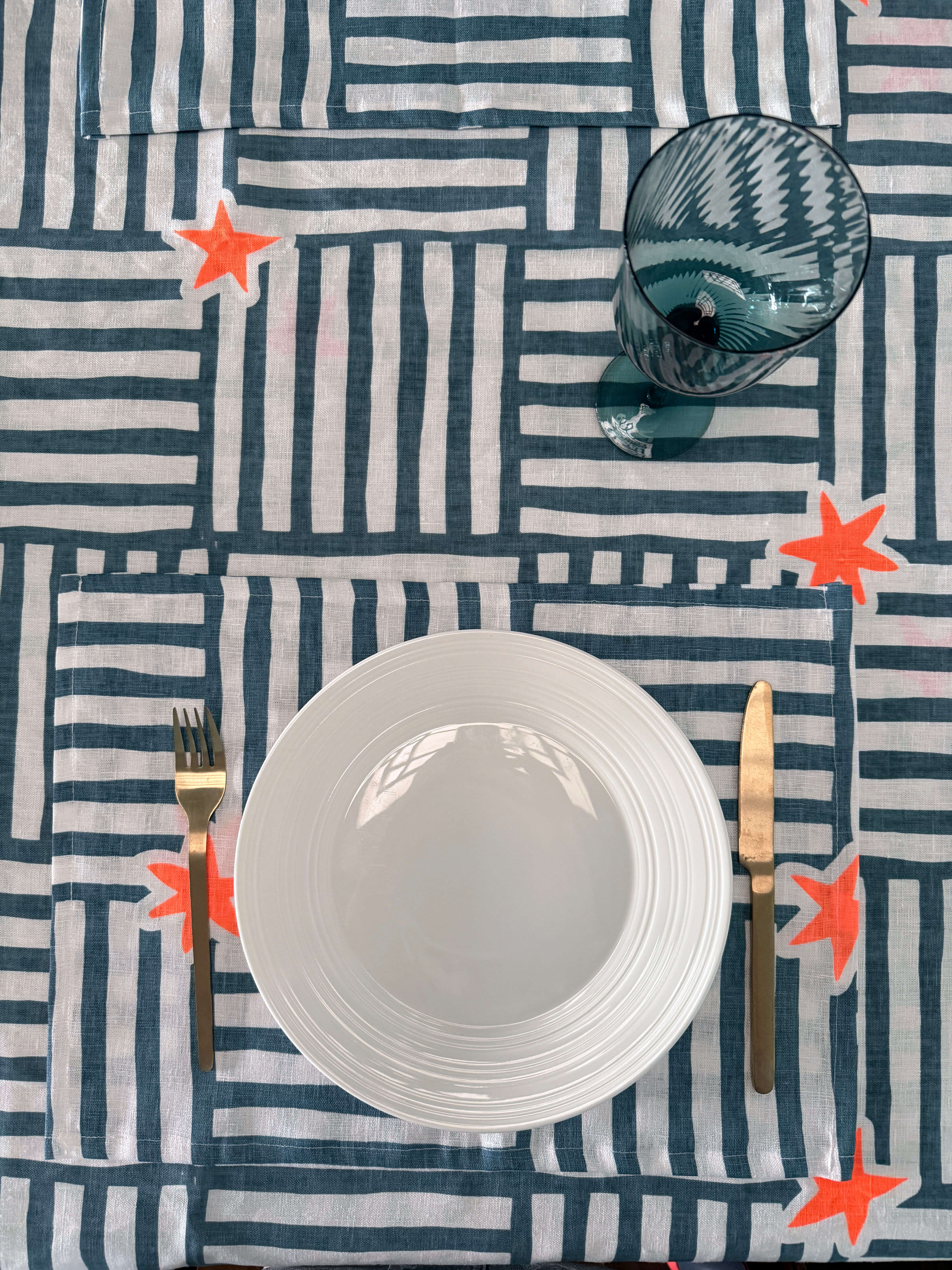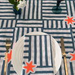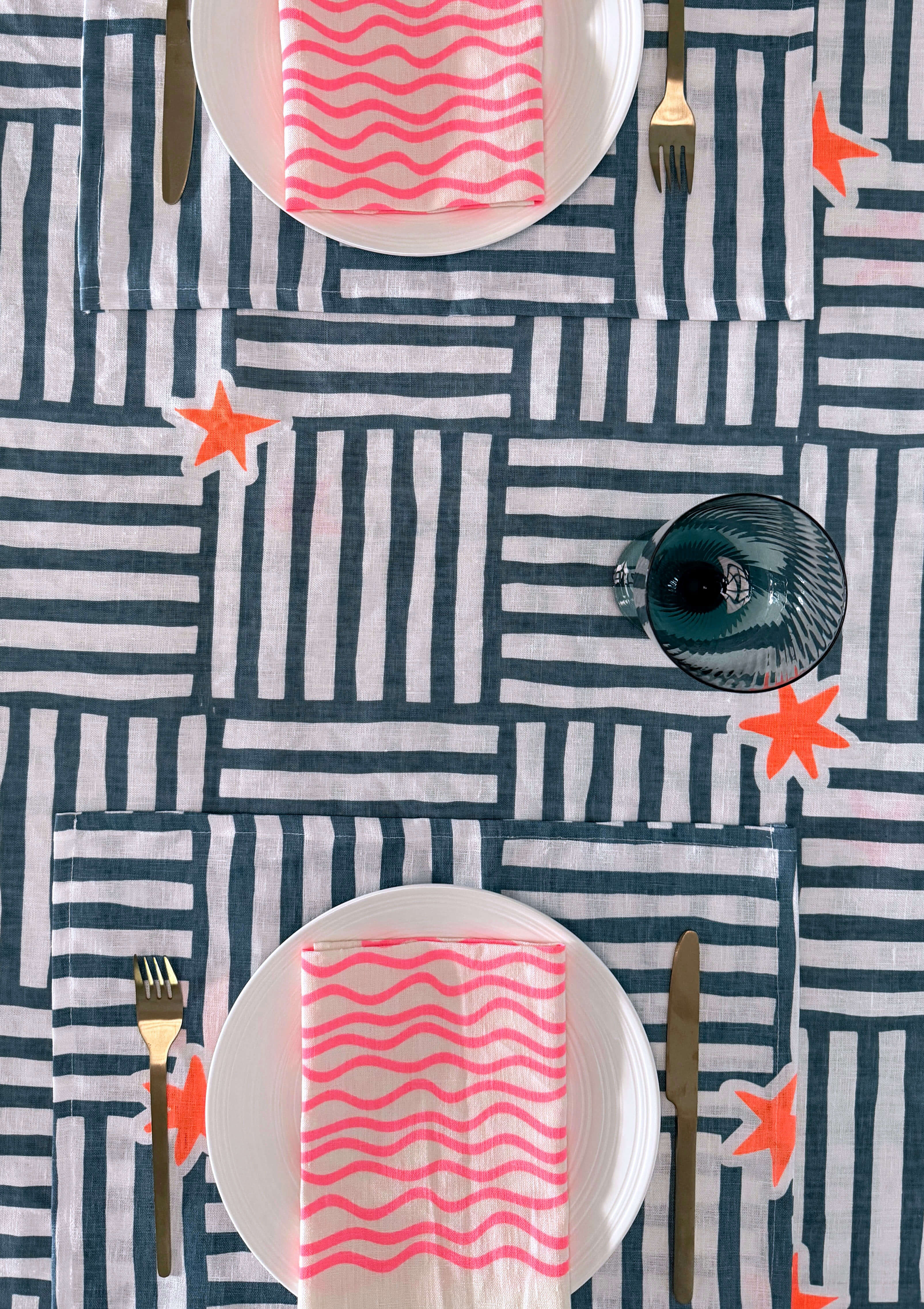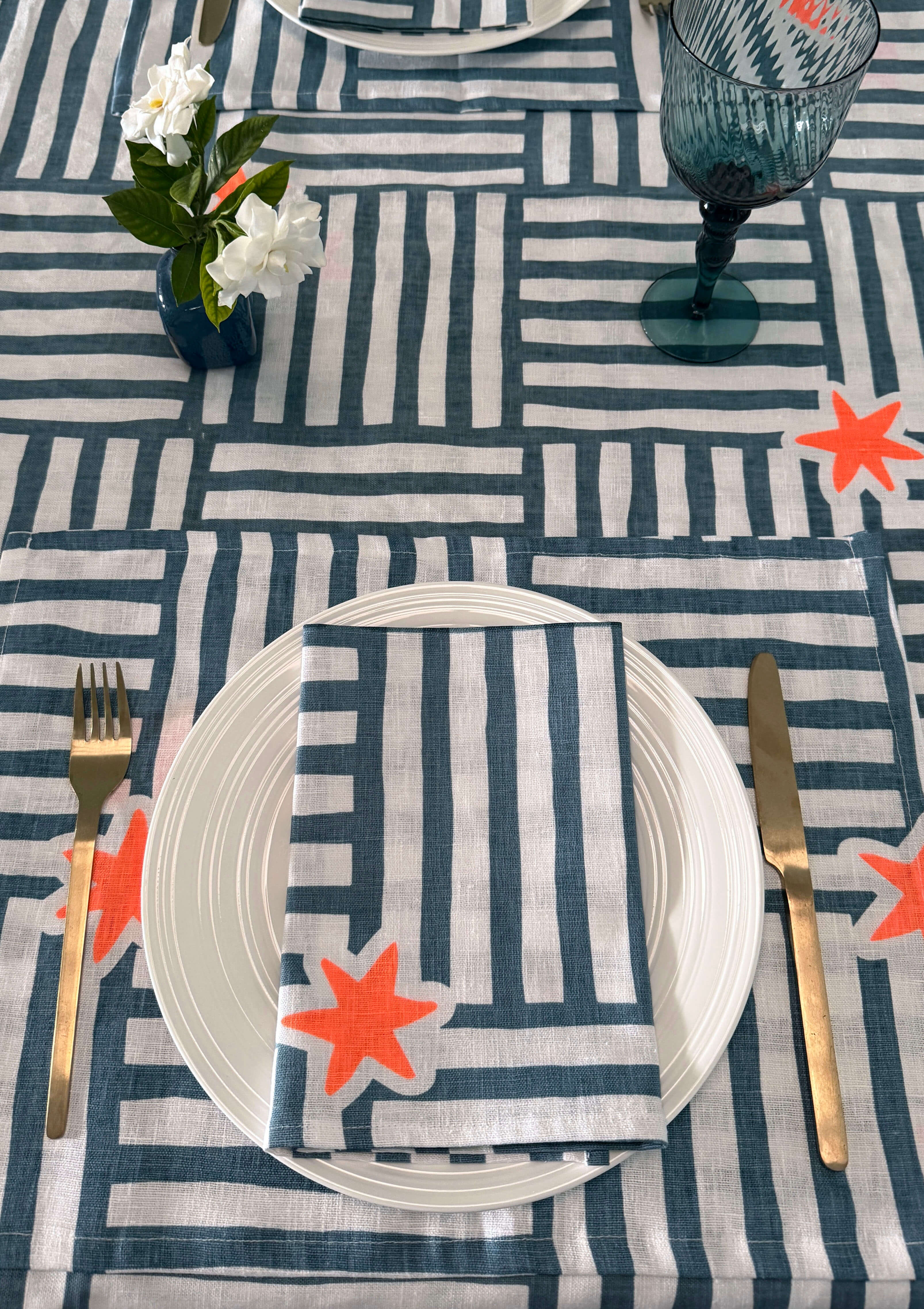 - Blue basketweave stripes with neon orange irregular shaped stars are hand printed onto white linen.