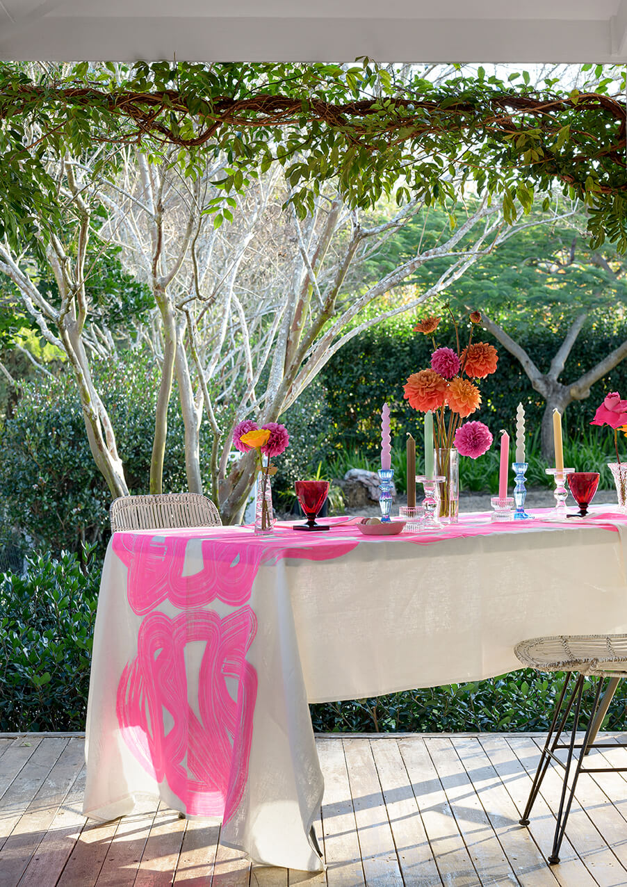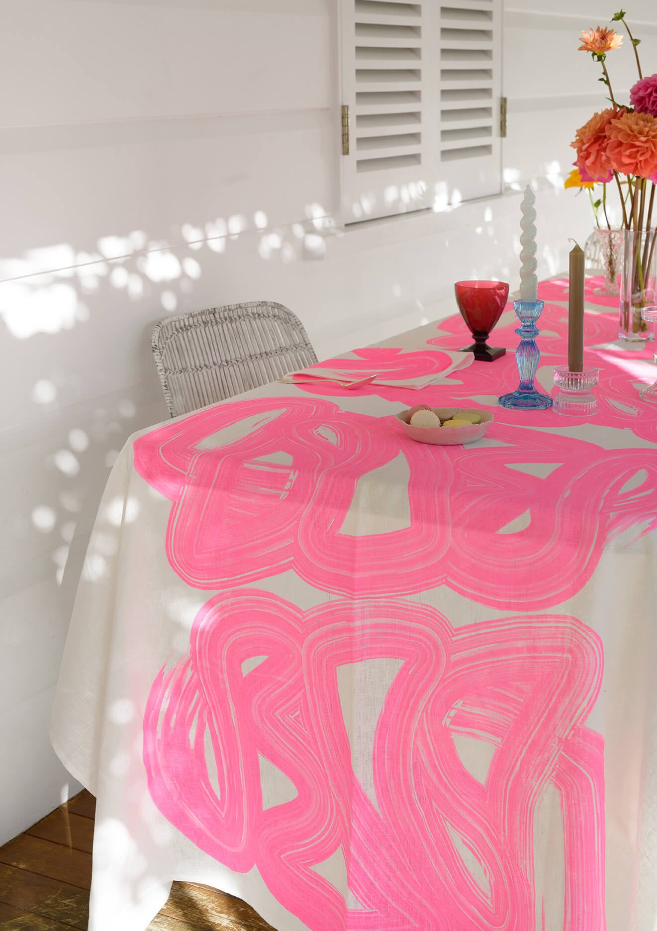 'GRAFFITI' - big, bold graffiti style brush strokes are hand screen printed in vibrant highlighter pink onto off-white linen napkins. Designed to match Graffiti tablecloth in either pink or green colourway, these napkins complete the look of total outrageousness.