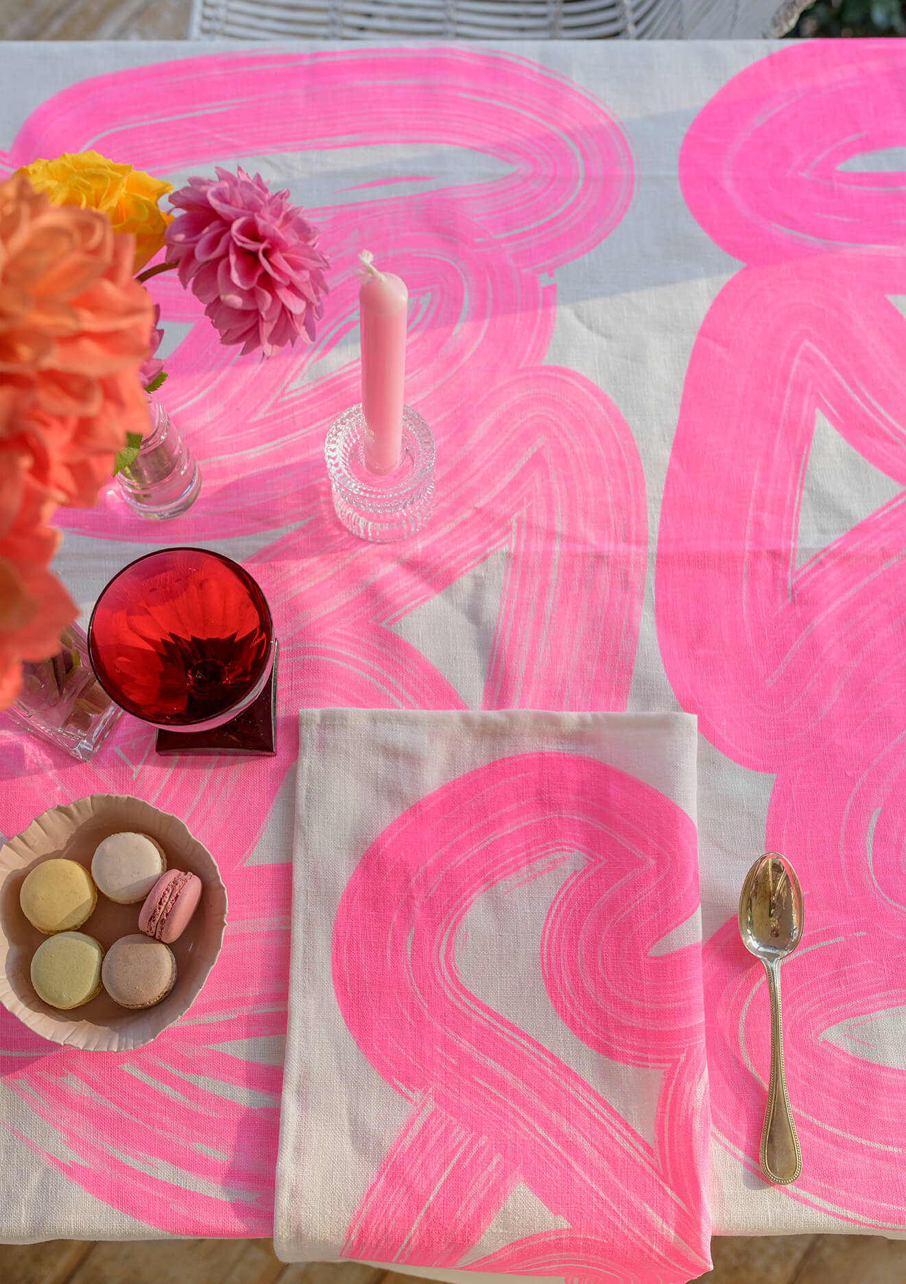 'GRAFFITI' - big, bold graffiti style brush strokes are hand screen printed in vibrant highlighter pink onto off-white linen napkins