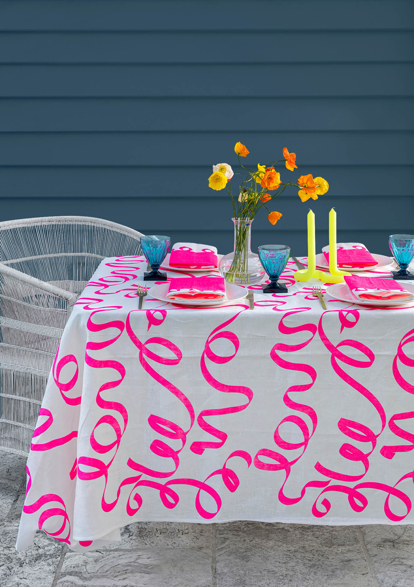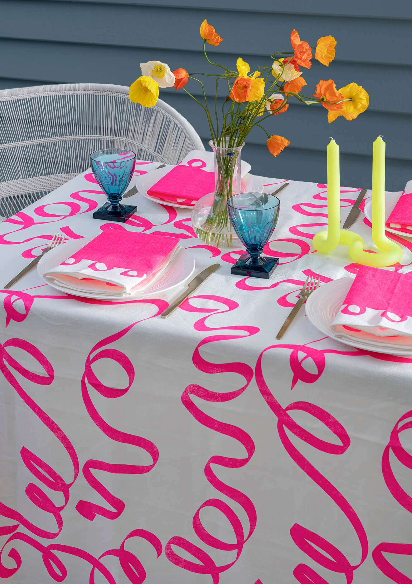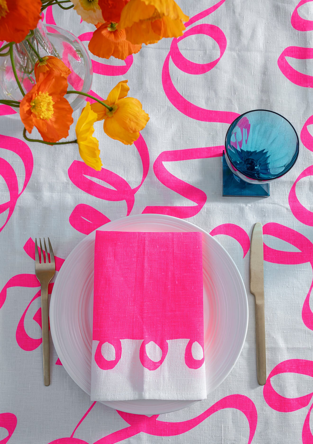 'Ribbon' - with twists and swirls of bold colour, our Ribbon design is hand screen printed in highlighter pink on off-white linen. Add matching napkins and placemats to create a statement table setting.