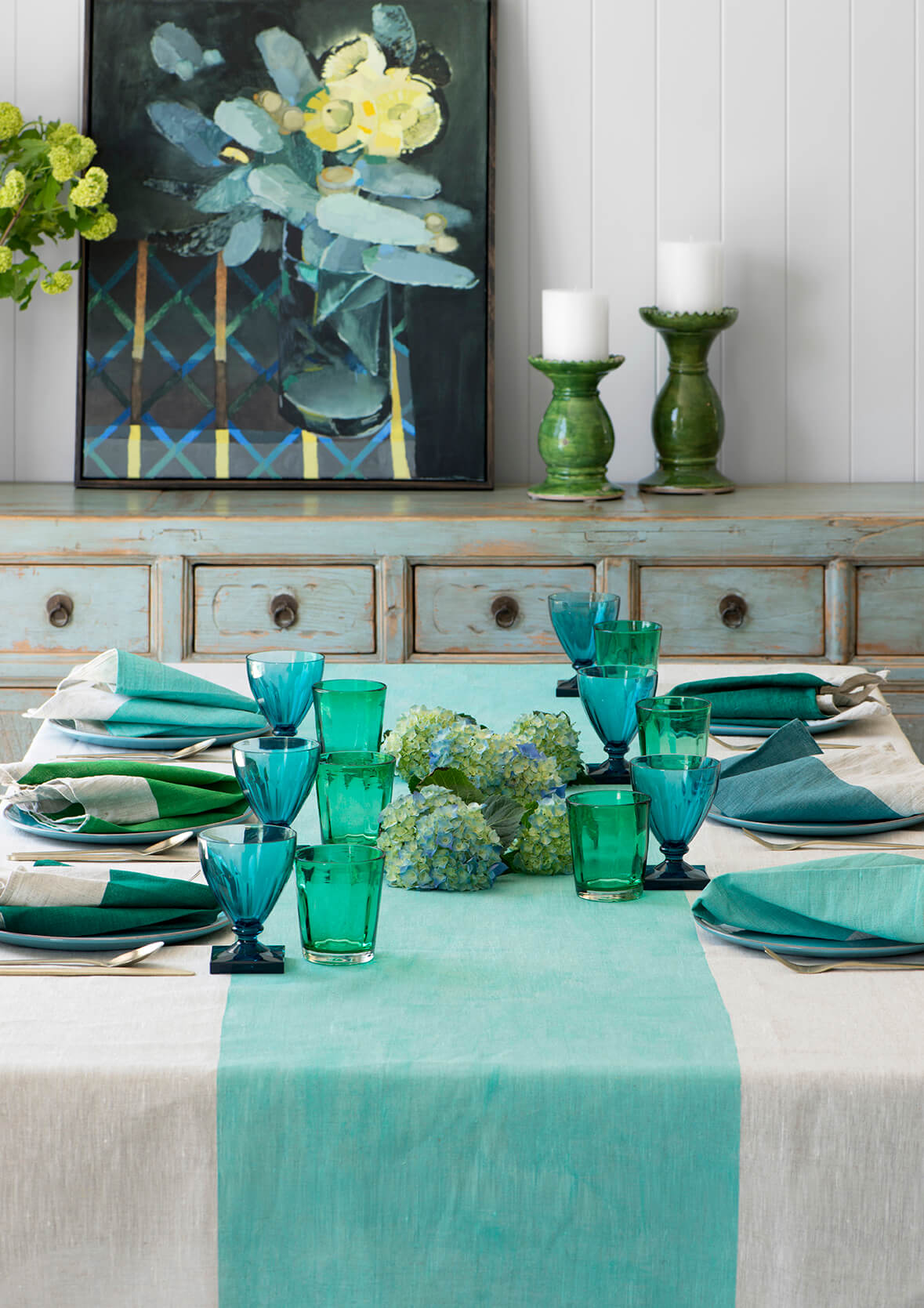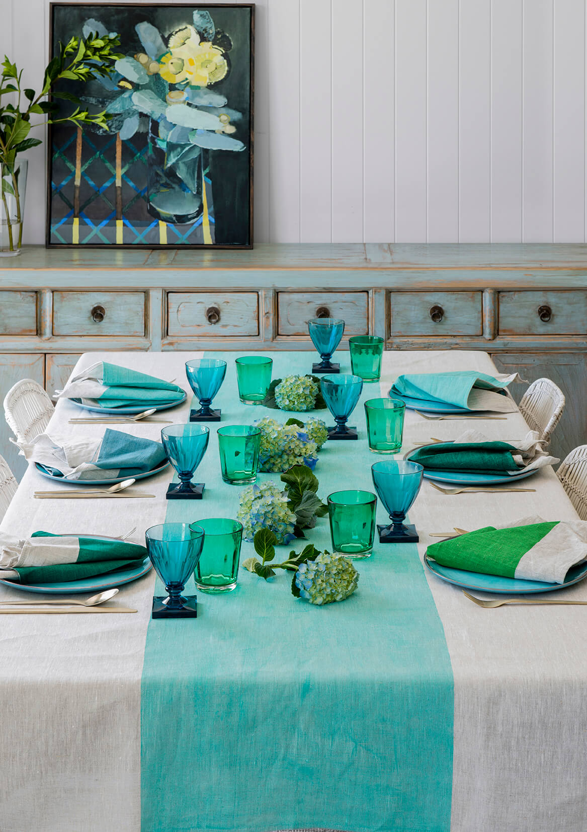 Simple yet striking - a wide colourblock panel is hand painted in aqua down the centre of the natural linen tablecloth