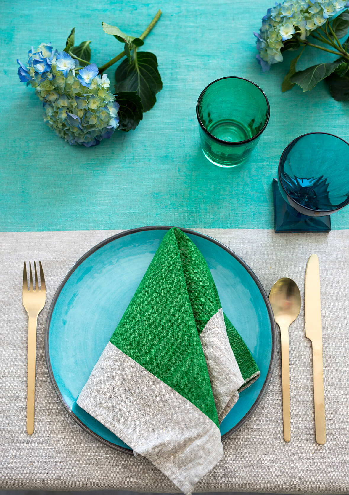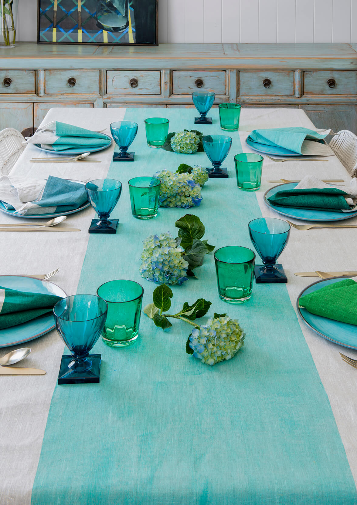 Simple yet striking - a wide colourblock panel is hand painted in aqua down the centre of the natural linen tablecloth. Pairs back beautifully with any of our green, blue or pink napkins.
