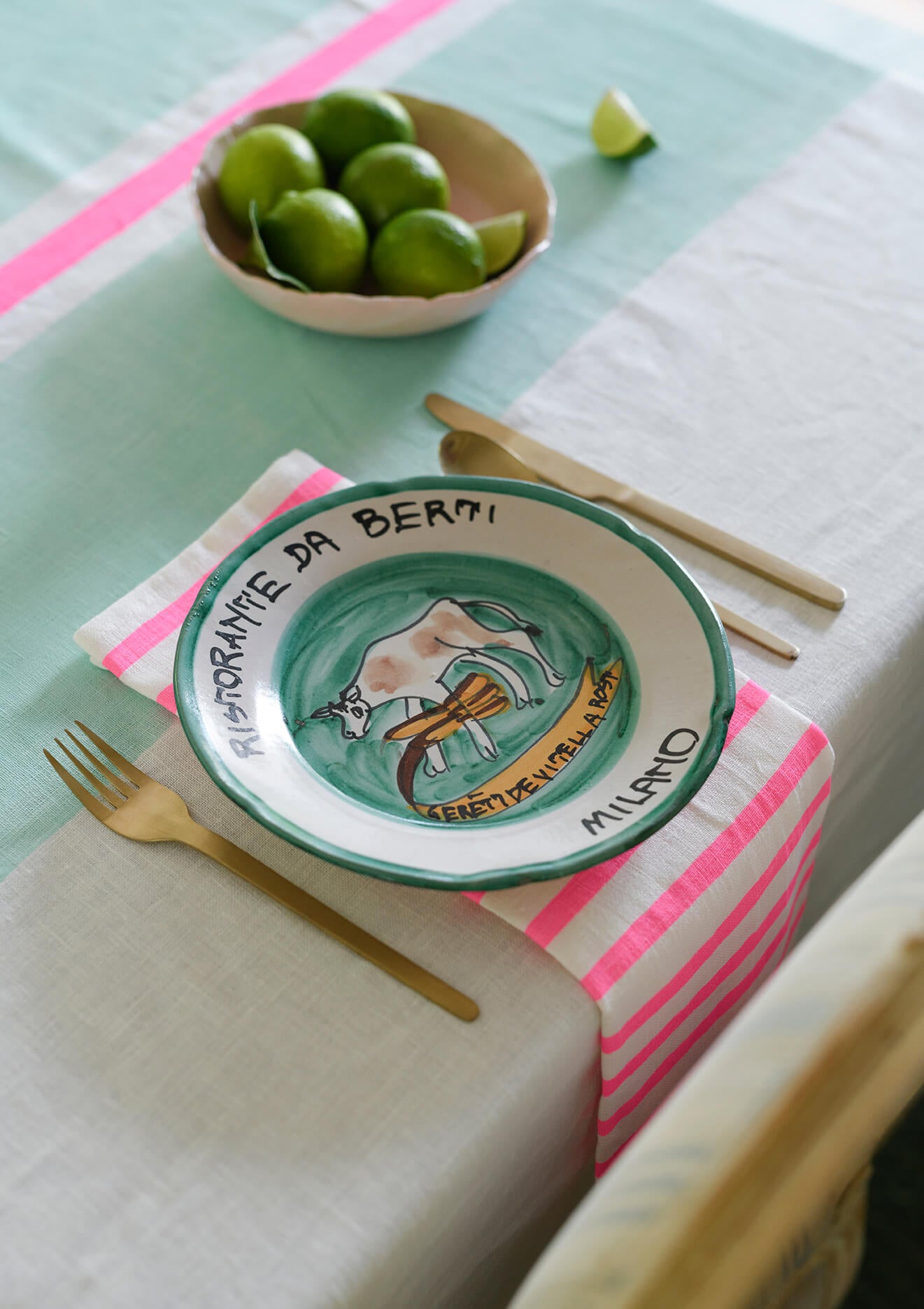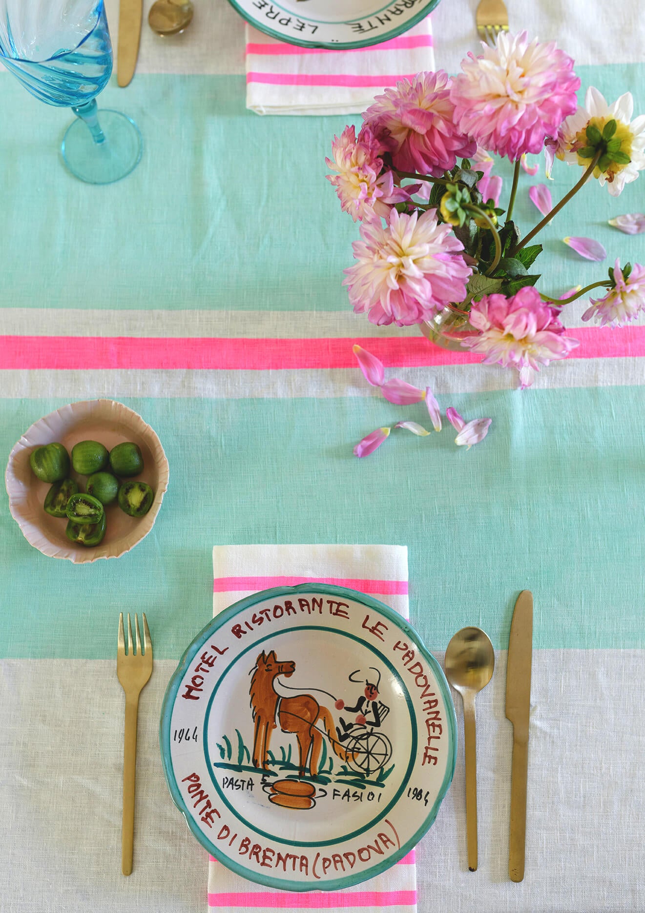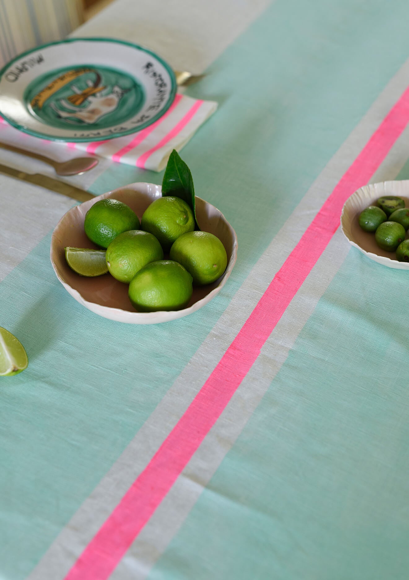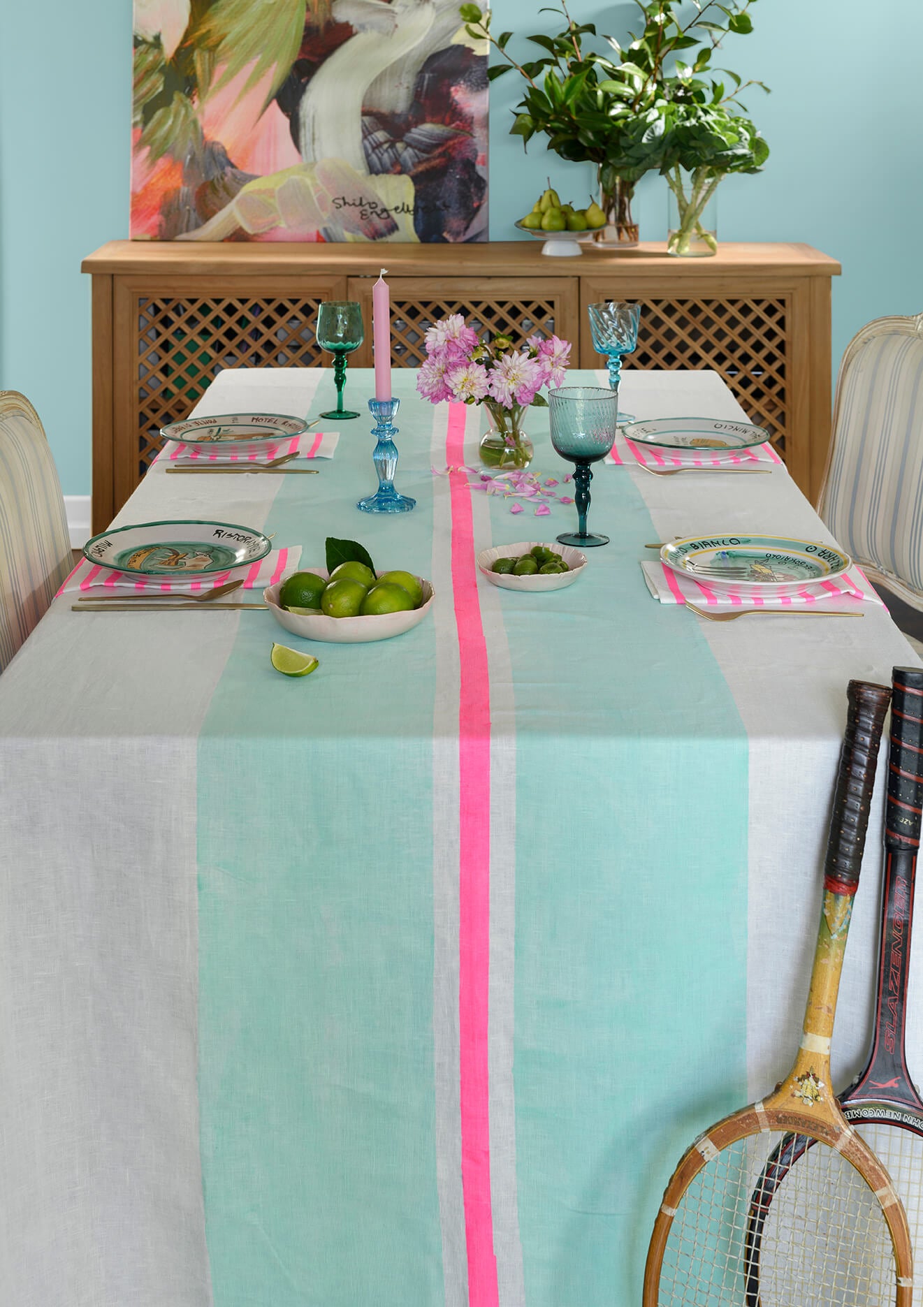 Tennis stripe tablecloth is simple yet striking - Colourblock stripes are hand painted in aqua + highlighter pink down the centre of the off-white linen tablecloth. Pair back with stripe napkins.