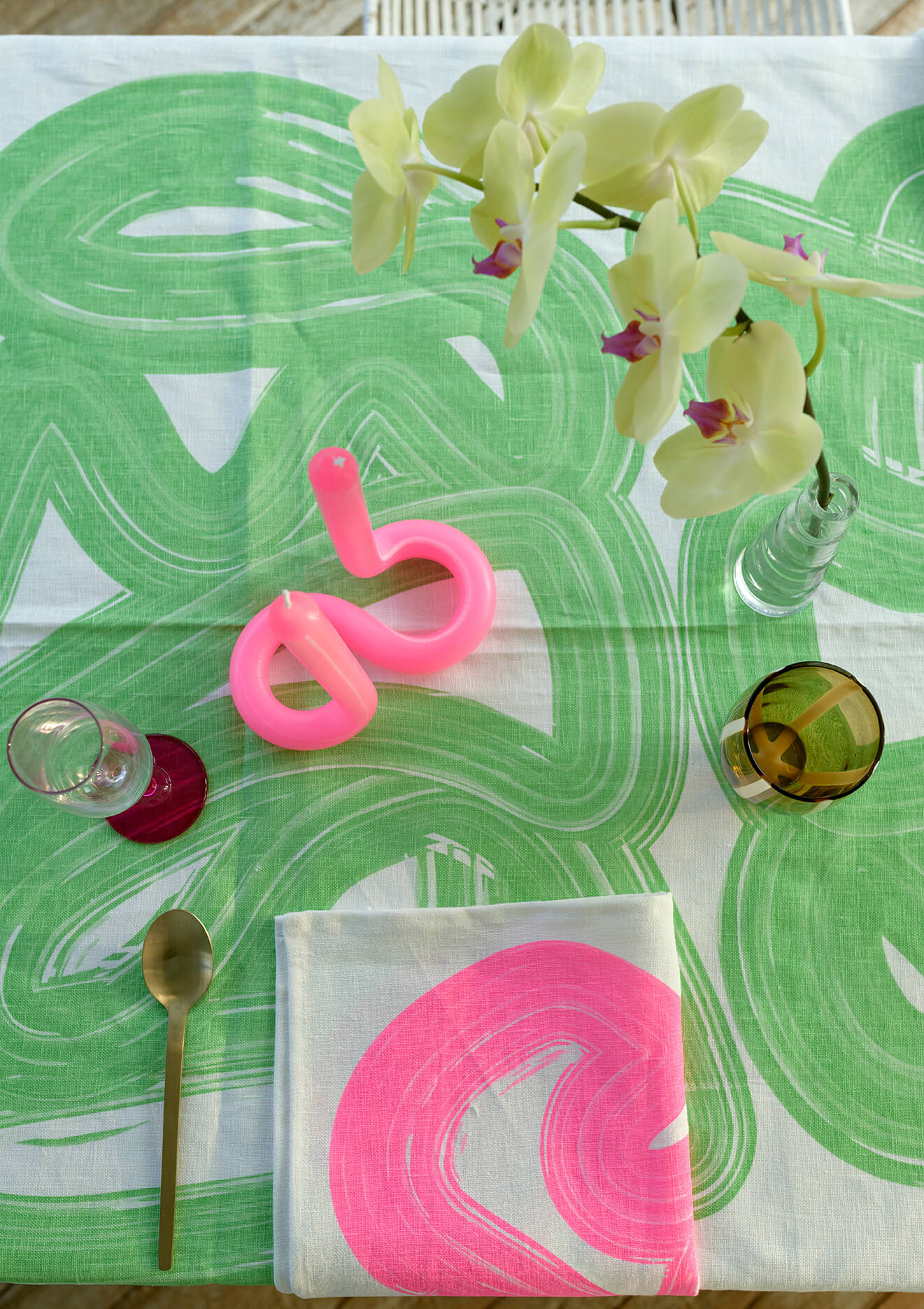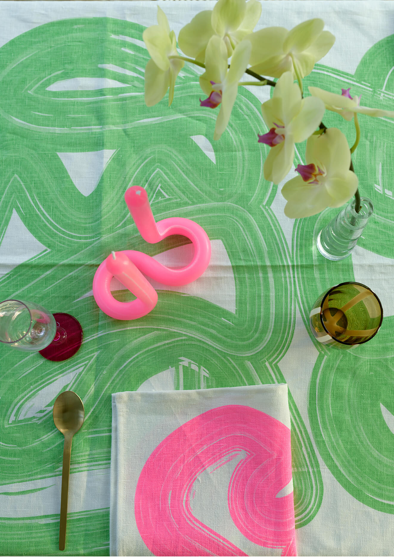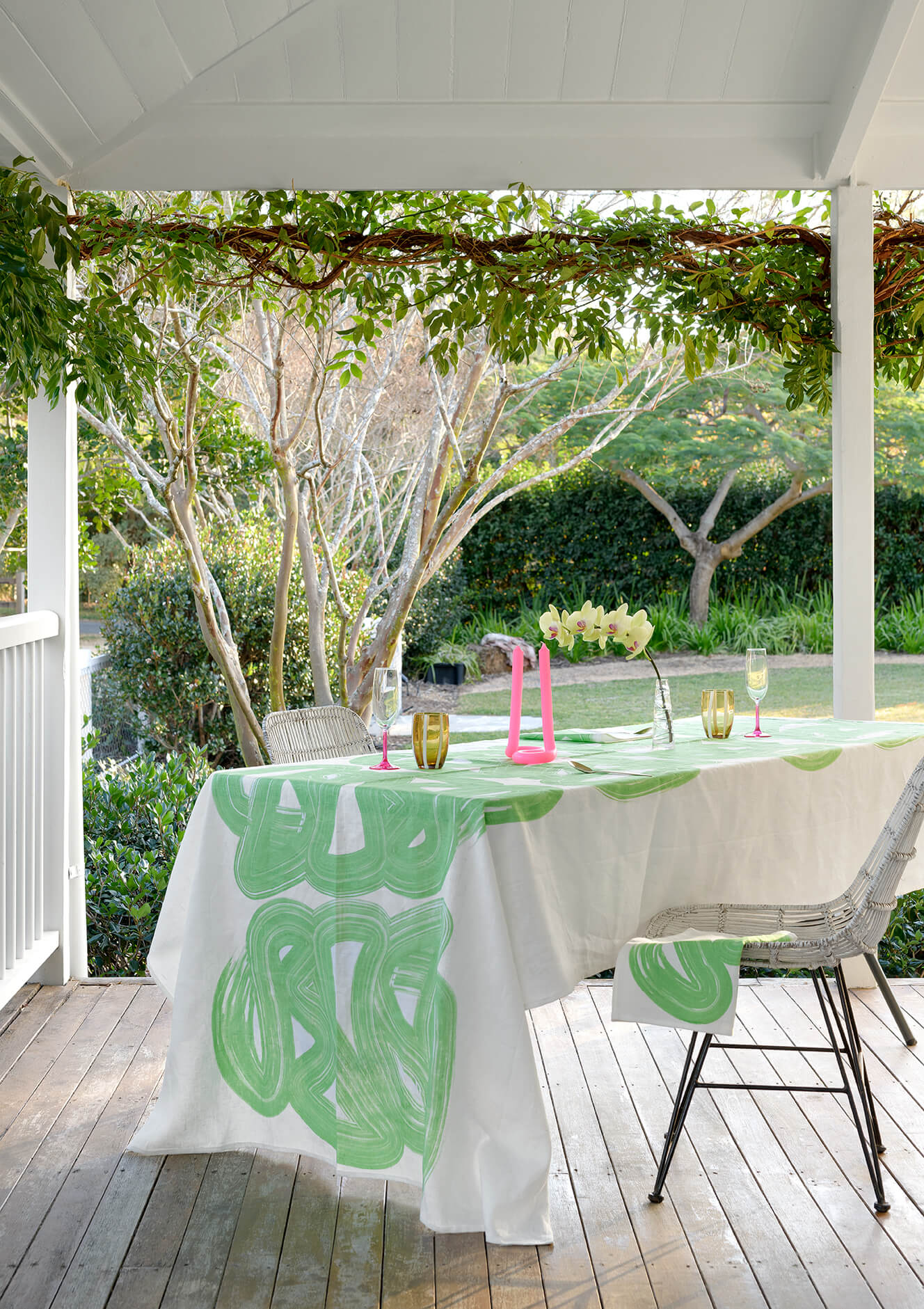 'GRAFFITI' - Big, bold graffiti style brushstrokes are hand screen printed in bright 'frog' green down the centre of an off-white linen tablecloth. Create a truly memorable and outrageous table with Graffiti tablecloth, napkins and an eclectic mix of colourful glassware, candles and cutlery. Doesn't matter what food you serve, when the table looks this amazing.