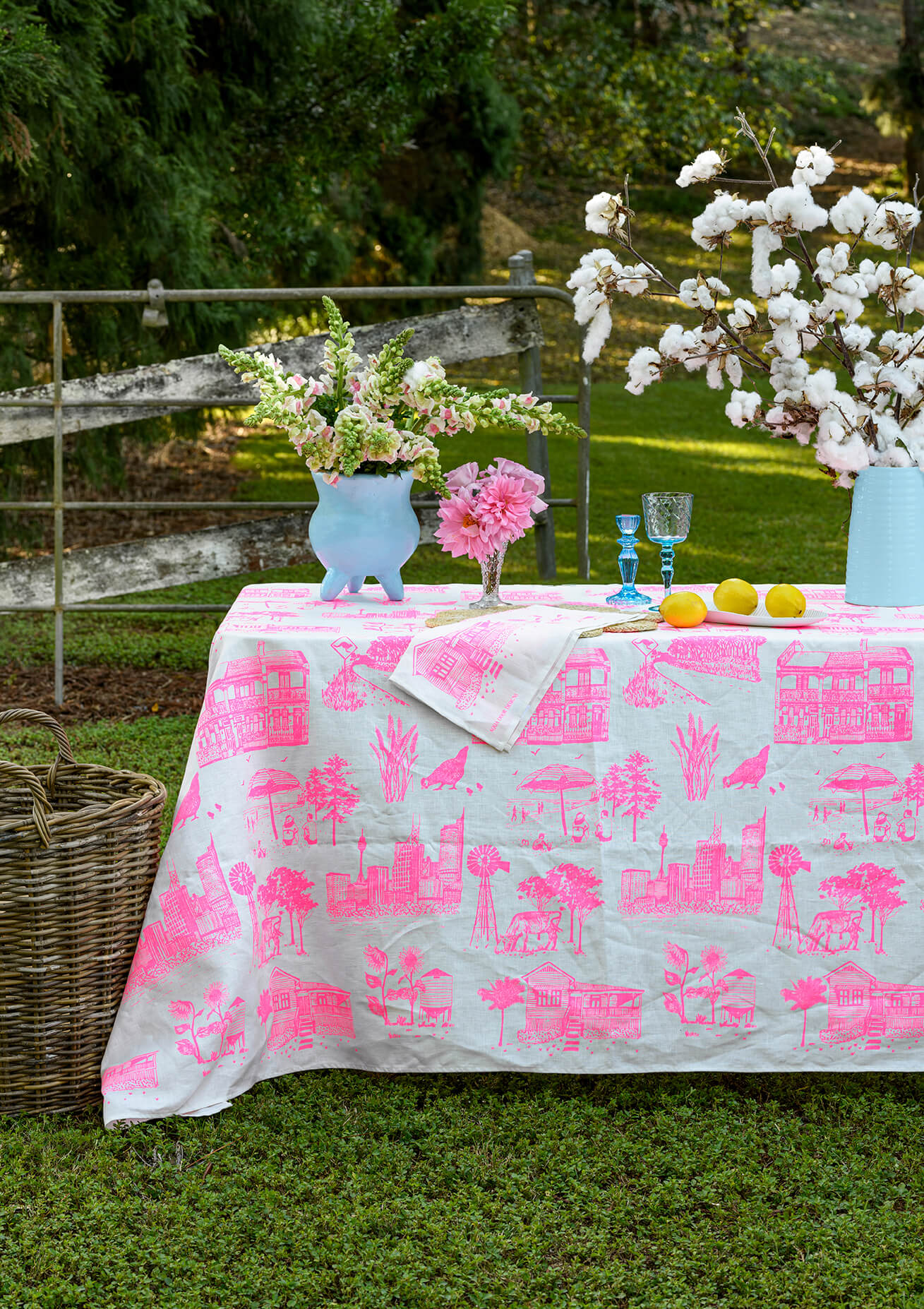 Highlighter pink Bush and the Big smoke linen tablecloth