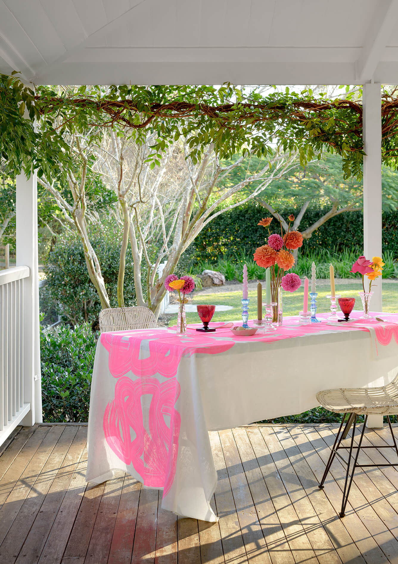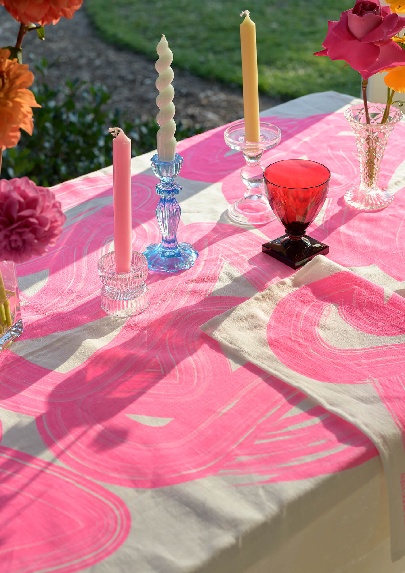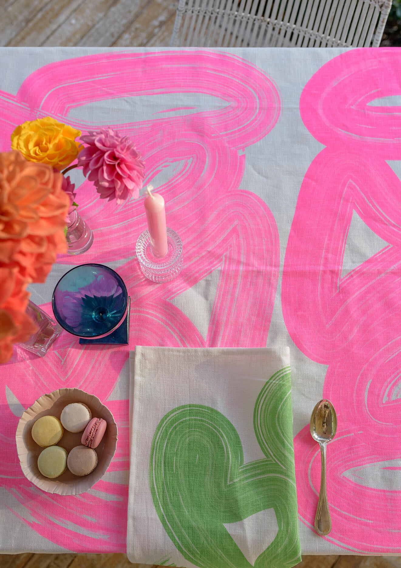 'GRAFFITI' - Big, bold graffiti style brushstrokes are hand screen printed in vibrant highlighter pink down the centre of an off-white linen tablecloth. Create a truly memorable and outrageous table with Graffiti tablecloth, napkins and an eclectic mix of colourful glassware, candles and cutlery. Doesn't matter what food you serve, when the table looks this amazing.
