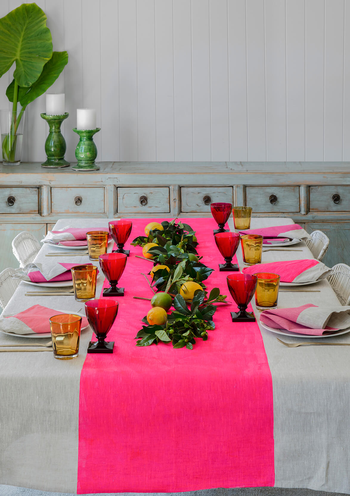 Simple yet striking - a wide colourblock panel is hand painted in vibrant neon pink down the centre of the natural linen tablecloth.