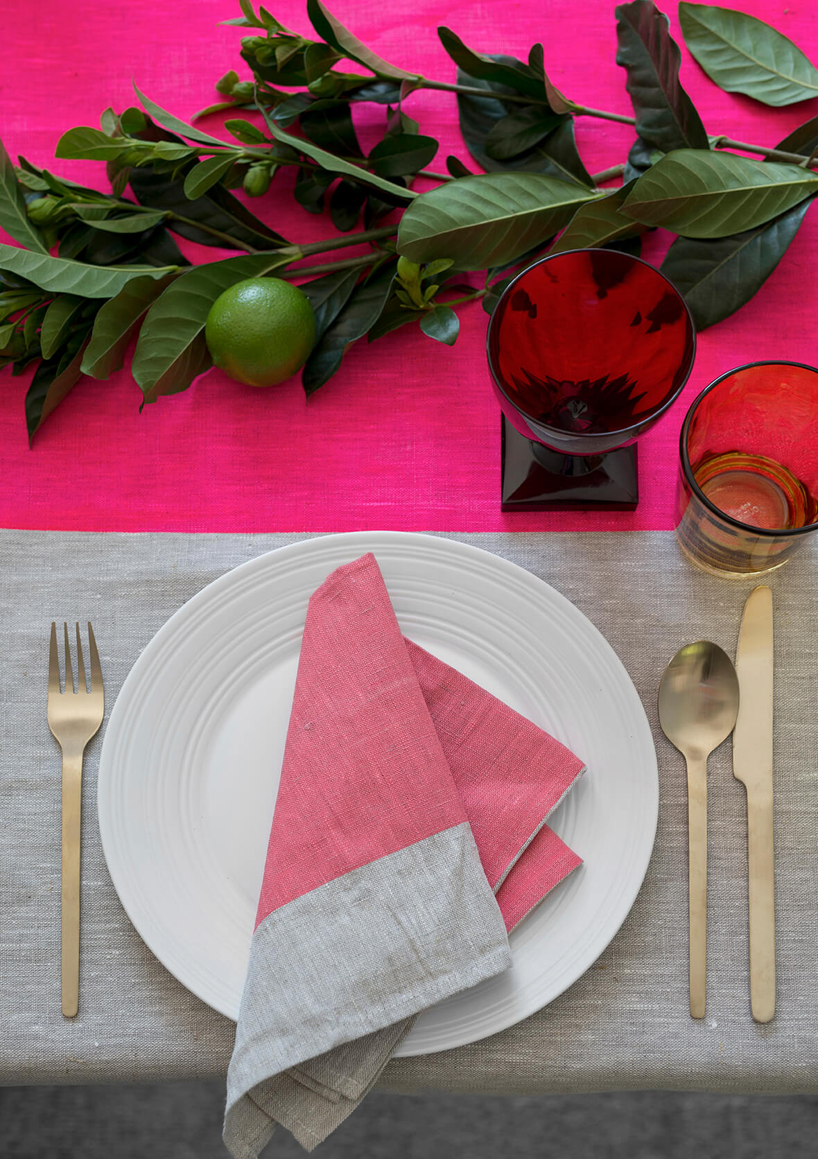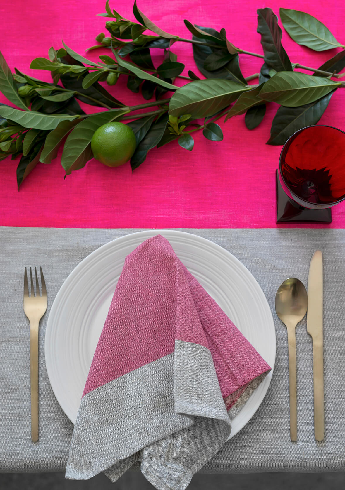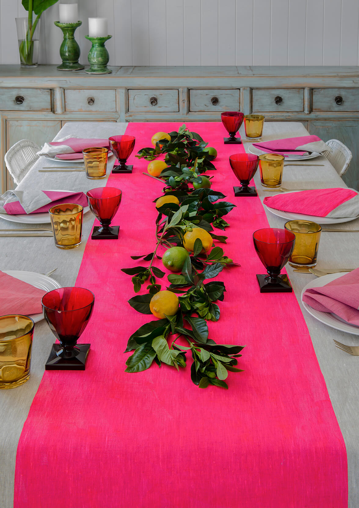 Simple yet striking - a wide colourblock panel is hand painted in vibrant neon pink down the centre of the natural linen tablecloth. Pair with any of our neon pink napkins to create a stunning and memorable table setting.